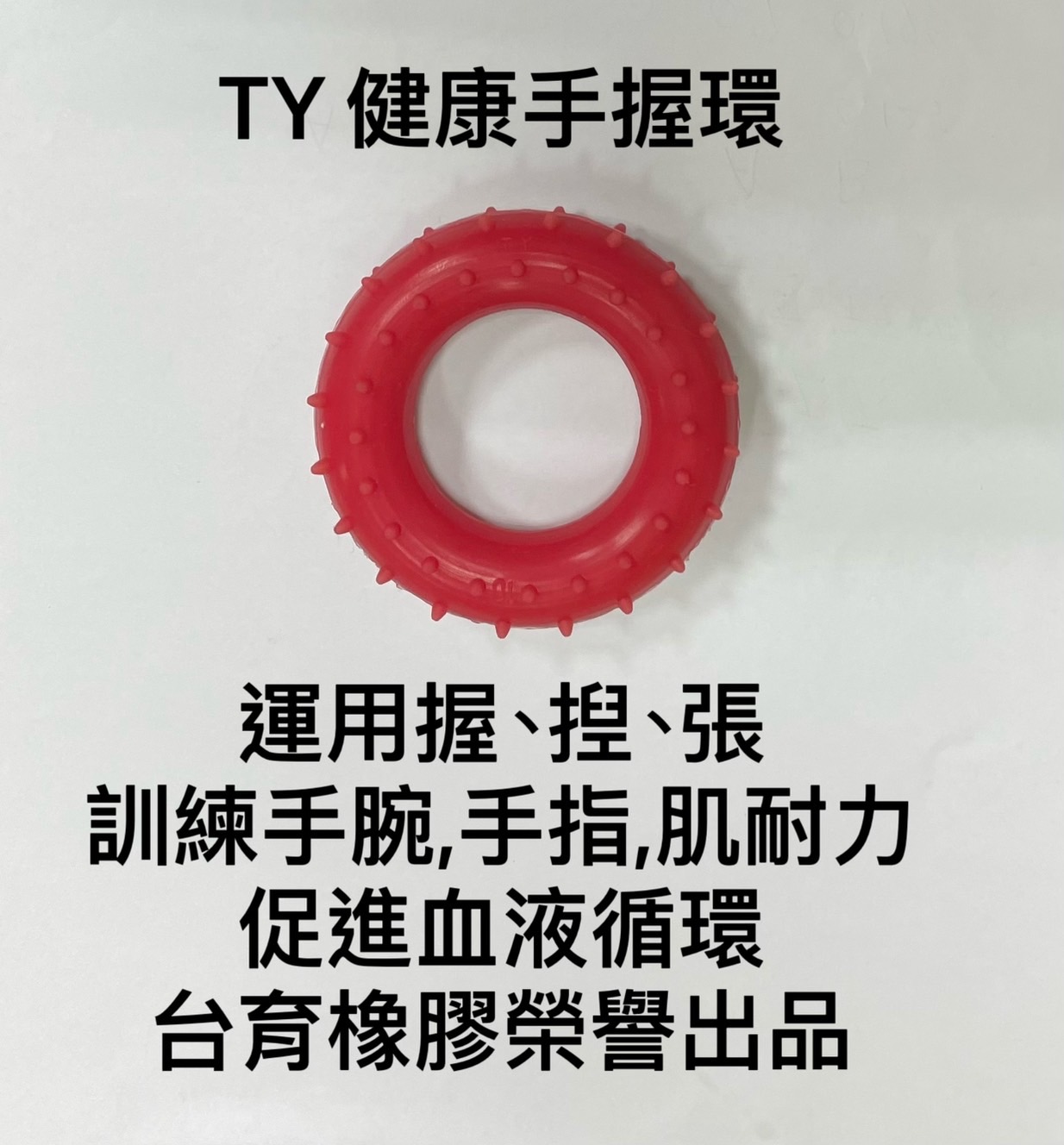這款TY健康手握環是由台育橡膠榮譽出品的實用運動小物,外型簡潔圓潤,採用高彈性橡膠材質製成,手感舒適且富有彈性,適合各年齡層族群日常使用。手握環透過反覆握、捏、張的動作,能有效訓練手腕、手指及前臂肌群,增強肌耐力與握力,是居家保健與復健運動的好幫手。